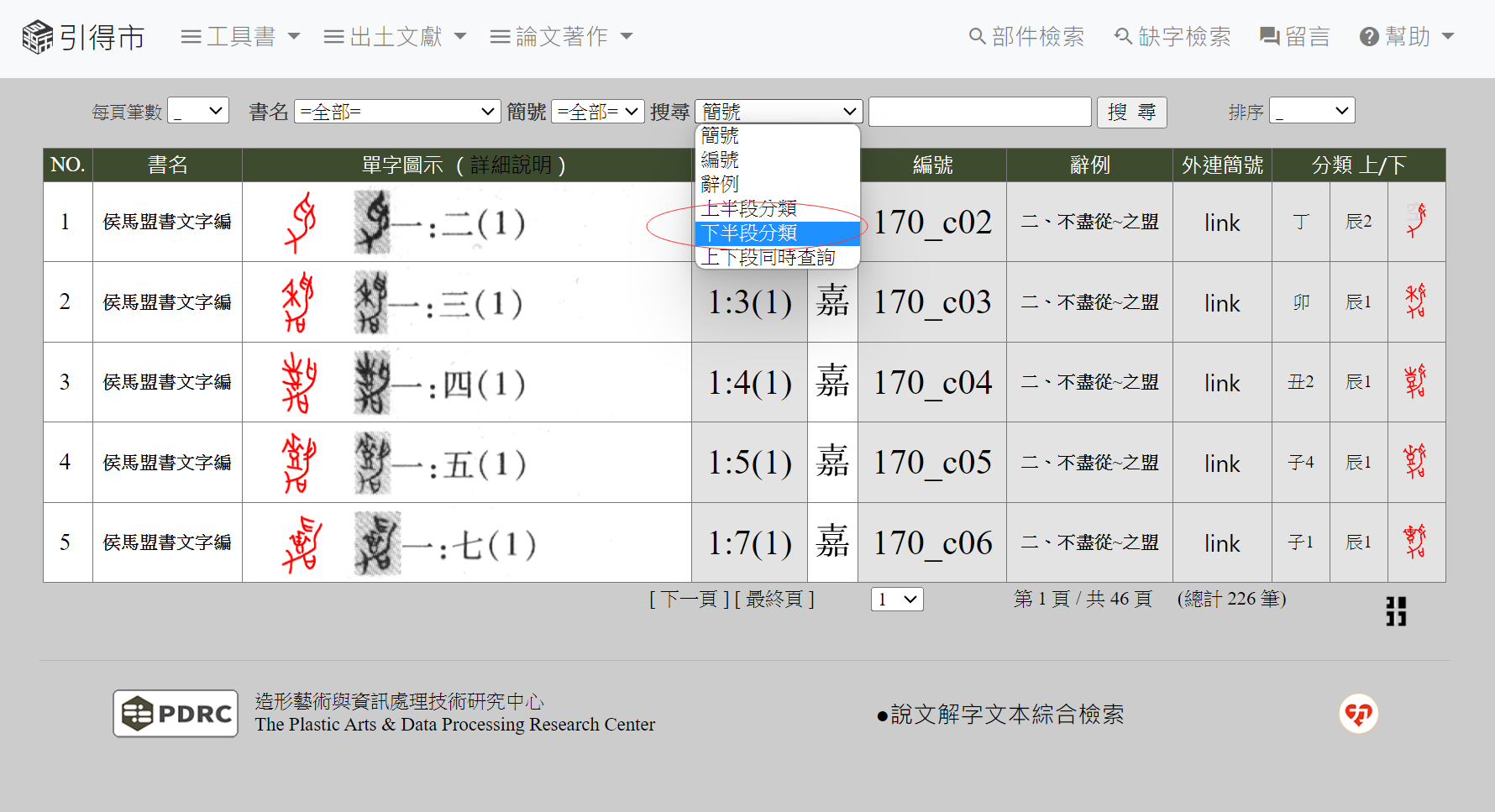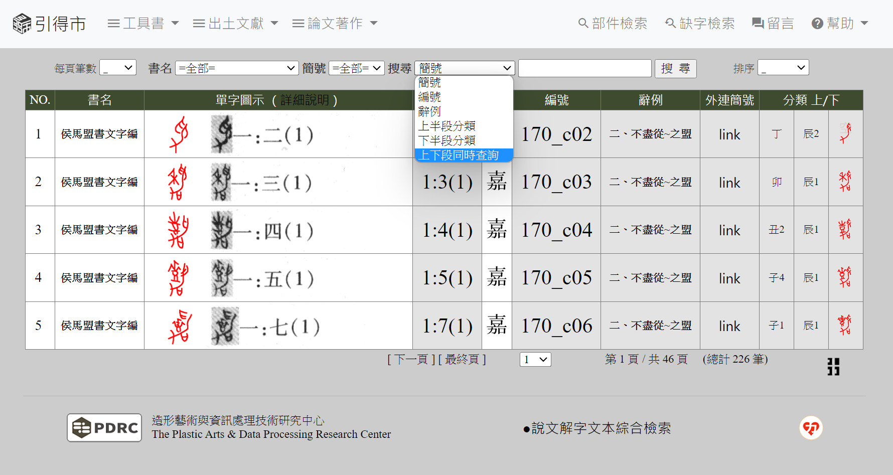 搜尋選單選擇:「上下段同時查詢」,可輸入「子1_辰1」、「「卯_辰2」…等六十九種。(※上下段代號請記得補上「_」符號)