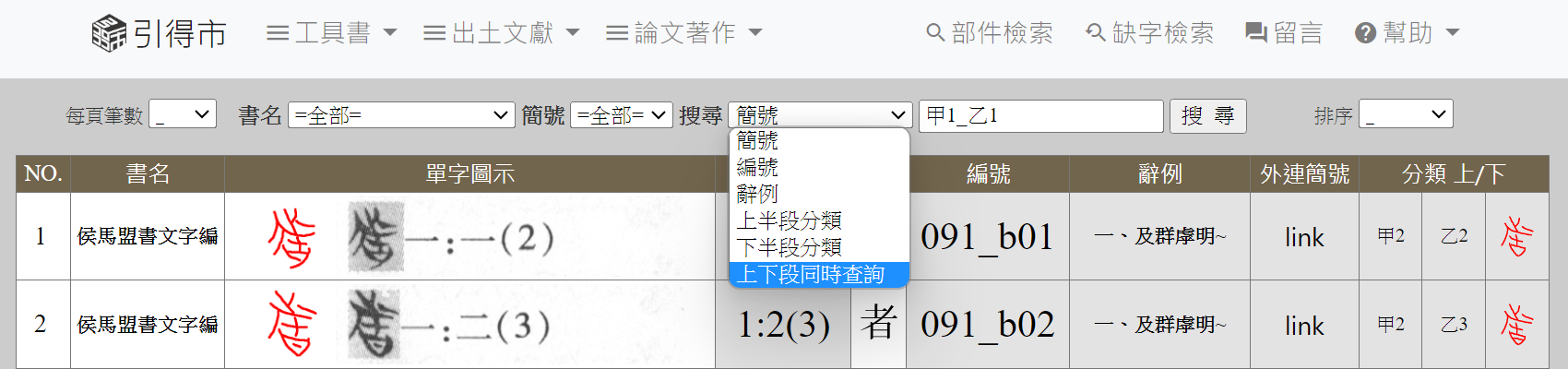 搜尋選單選擇:「上下段同時查詢」,可輸入「甲1_乙1」、「「甲1_乙2」…等三十二種。(※上下段代號請記得補上「_」符號) 如下圖所示: