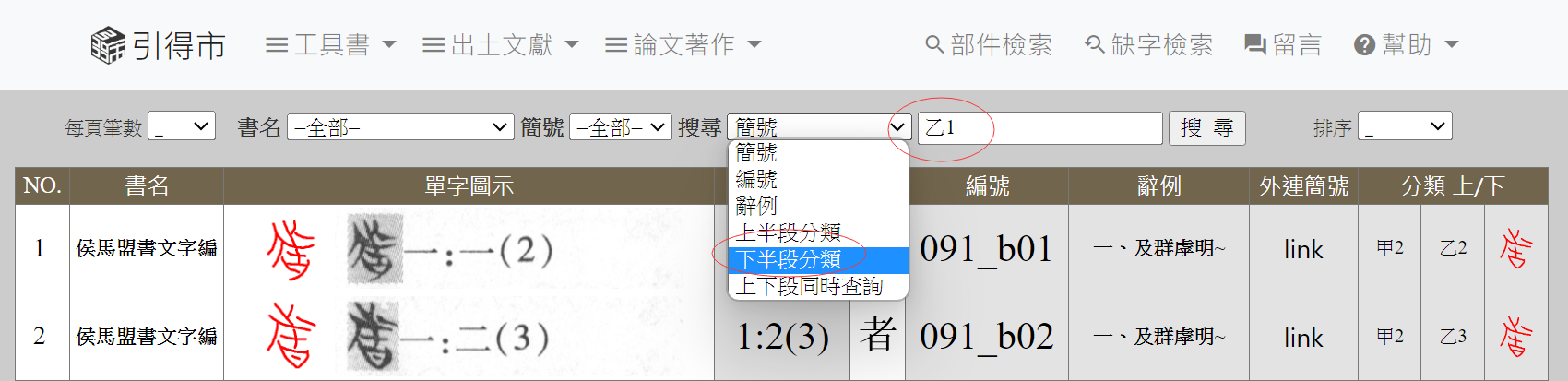 搜尋選單選擇:「下半段分類」,可輸入「乙1」、「乙2」…等六種。 如下圖所示: