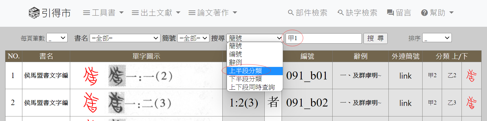 搜尋選單選擇:「上半段分類」,可輸入「甲1」、「甲2」…等四種。 如下圖所示: